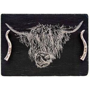 Featuring striking stainless steel cow horn shaped handles, this Just Slate Company Medium Highland Cow Slate Serving Tray is ideal for presenting your favourite appetisers on. Perfect for meats, cheese and crackers, canapes or a selection of nibbles. This high quality slate serving tray has been handcrafted in Scotland and is engraved with a shaggy and loveable highland cow. This slate serving tray is supplied in a gift box and would make an ideal present, especially as a housewarming or wedding gift. Slate serving tray dimensions: 35cm x 25cm. Wipe clean. Combine the Just Slate Company Medium Highland Cow Slate Serving Tray with matching place mats and coasters for a coordinated look.