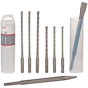 SDS drill bit and chisel set made from durable carbide with a reinforced core section for wear resistance. Self-sharpening pointed chisel. Suitable for drilling, demolition and correction in concrete and masonry, with a centring tip for a precise drilling start. Supplied in a plastic tube. Features 4-Flute dura design drill bits Long life chisels Specification Material: Carbide Metal Applications: Stone, Masonry, Concrete Tool Holder: SDS-Plus Part No.: 2607017376 Standard Equipment 1x 5.5 x 100 x 160 mm 1x 6.0 x 100 x 160 mm 1x 7.0 x 100 x 160 mm 1x 6.0 x 150 x 210 mm 1x 6.5 x 150 x 210 mm 1x 7.0 x 150 x 210 mm 1x 250 mm Flat Spade Chisel 1x 250 mm Bull Point Chisel 1x Plastic Storage Tube