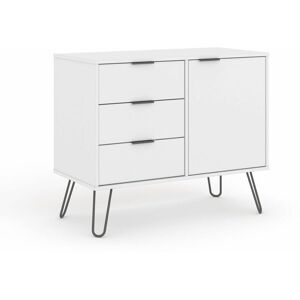 Our Vigo Grey range combines real wood with a rich grey wax and metal to bring a casual industrial styled look to your home. The simple lines and black stove painted metal legs blend perfectly with the cabinets which are finished with a grey washed wax finish enabling the natural grain and characteristics of the wood to show through. The raised base makes cleaning under these pieces of furniture so much easier. The small Vigo Grey sideboard with 1 door and 3 drawers is an ideal combination of storage in a compact piece for your dining or living room. The cupboard door has adjustable metal hinges, in case your floor is uneven, it also has an adjustable shelf to suit your own requirements. The three drawers are useful for cutlery and tableware or even for paperwork and the top is handy as a serving area. Size = (W) 90cm (D) 43cm (H) 73.6cm