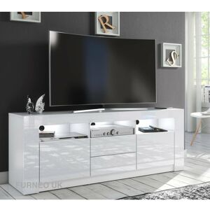 The cabinet features a high gloss white finish to the front (including doors and front panels) with the rest of the body (top, sides and inside) in a matt white finish. The TV unit features two cupboards, two drawers and three open spaces for the storage of media units, each open space includes a hole for cable management. Suitable for TV’s up to 70in. Dimensions: (WxHxD): 160x60x40cm Blue LED lights are included (3 LED strips + UK Power adapter), they are mains powered with a UK power adapter and foot switch to turn them on and off. Note that this is a flatpack item and will require assembly. Picture instructions, and a written notice are included with the item, these should be looked over carefully, before attempting assembly. The item is supplied flat packed in two parcels.