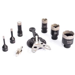 The Vaunt X 4 Piece Vacuum brazed diamond hole saw set is ideal for the toughest materials such as granite, marble, porcelain tiles, stone and brick!! The M14 fitting allows direct connection to an angle grinder and the high diamond content and vacuum brazing process ensures a permanent bond giving long-life and outstanding performance and accuracy. Bits from 6mm - 18mm are pre loaded with a wax to prolong the life of the bit and protect the work piece. The included guide helps keep your hole straight and true. 1x 6mm Diamond drill bit 1x 8mm Diamond drill bit 1x 18mm Diamond drill bit 1x 25mm Diamond drill bit 1 x Hex to M14 adaptor 1 x Suction guide Carry caseHigh diamond countVacuum brazed constructionSuitable for both wet and dry drillingIdeal even in the toughest materials