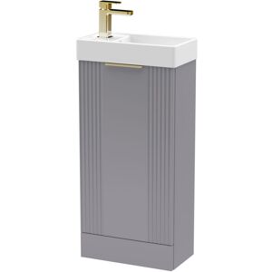 Grey 400mm Floor Standing Cloakroom Vanity Basin Unit with Brushed Brass Handle Compact Bathroom Storage Timeless grey, elevated with subtle brass detail. Make a statement of timeless practicality. The floor-standing design offers a solid, grounded presence while delivering generous storage, making it the ideal choice for busy households that value both style and everyday convenience. Built with strength and stability in mind, the Retro floor-standing units use premium materials and careful craftsmanship to deliver a product that stands the test of time. Each piece is engineered for durability and finished to perfection, blending function with elegance. Product Highlights: STYLE: Add a bold statement to your bathroom with the Retro range. Featuring clean grooves, a contemporary finish, and a brushed brass handle, this stylish unit is available in a variety of colours to perfectly complement your modern bathroom design. COMPACT DESIGN: Ideal for small bathrooms or cloakrooms, the Retro
