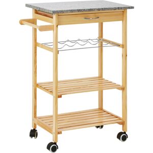 Streamline your kitchen with the Interiors by Premier pinewood large kitchen trolley. The elegant design, durable pinewood build and a beautiful grey granite surface of this kitchen cart on wheels, creates a warm and inviting aesthetic that complements a variety of kitchen styles. This versatile food trolley on wheels is packed with useful features. The smooth granite countertop of this kitchen island cart on wheels provide ample workspace for food preparation or serving. The single drawer of this rolling kitchen storage cart keeps your utensils organized and within reach, while the built-in, 4-bottle wine rack offers a stylish storage solution for your favorite wines. A lower shelf on this solid wood kitchen cart on wheels provides additional storage for cookware, serveware, or other kitchen essentials. Maneuvering this rolling kitchen storage cart is effortless thanks to the four caster wheels. When needed, the wheels can be locked to keep the trolley securely in place. The