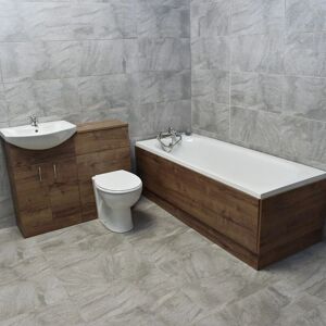 Imelda Walnut Oak Finish Vanity Sink Bathroom Suite Bath, plus WC Unit & Toilet Imelda 1675mm x 700mm bath Manufactured from 100% acrylic sheet as used my the worlds leading bathroom manufacturers Fibre glass reinforced Supplied with no tap holes, but can easily be drilled on site so you can choose where to put your taps Supplied with universal legs and adjustable feet With 1700mm walnut finish front bath panel PLEASE NOTE: see gallery images for NEW BATH DESIGN Bath now comes with an anti slip surface - see gallery image (700mm end bath panel not included, unless added as extra) Bath Sizes approx: External Length: 1675mm External Width: 695mm External Height: 555mm Internal Length near top: 1480mm Internal length near bottom: 1140mm Internal width near top: 520mm Internal width near bottom: 400mm Inside height max: 370mm Inside from bottom of bath to centre of overflow: 310mm 700mm end bath panel can be added at extra cost Mediterranean range 1050mm walnut finish vanity set includes