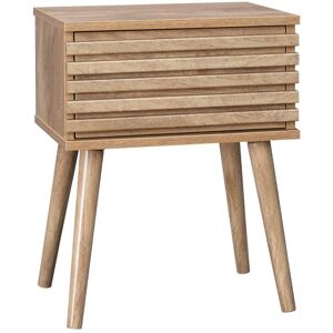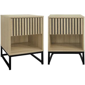 Product benefits : - 1 drawer (press-to-open system) - 1 storage niche - Grooved effect - Black metal base This bedside table is the perfect blend of modernity and practicality. Its grooved drawer adds a subtle touch of sophistication, creating a sleek, contemporary design. The natural wood colour adds a warm ambience to your bedroom. Thanks to its sturdy metal frame, this bedside table will stand the test of time, while retaining its elegance. The combination of wood and metal creates the perfect balance for those looking for modern style without compromising on durability. As well as enhancing your interior, this bedside table offers generous storage space: its push-open drawer makes it easy to store everything you need for a peaceful night's sleep. And as an added bonus, its open niche gives you the perfect space to display decorative objects or store other small items. Bedside table: W 40 x D 40 x H 55cm Top: W 40 x D 40cm Panel thickness: 1.5cm Niches: W 37 x D 39.7 x H 18.5cm