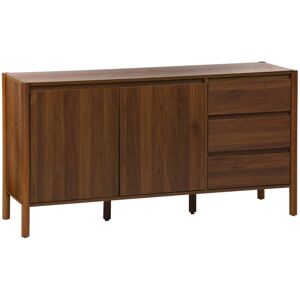 Product advantages: Contemporary design 5 storage spaces 2 doors and 3 drawers Adjustable middle legs In a living room or dining room, Harmony finds its natural place. Its design with six round legs gives it an elegant yet relaxed look, while its two doors and three drawers allow you to easily store your dishes. It brings a true sense of order without ever weighing down the space. The adjustable central legs ensure perfect stability, even on somewhat capricious floors. Once installed, it changes the ambiance of the room: warmer, more welcoming, as if everything becomes a bit softer. Additional information: Other sideboard and buffet sizes are available in this range. Dimensions and features: Type: Sideboard Shape: Rectangle Style: Contemporary Material: MDF / Particle board Top material: Particle board / Melamine finish Base: Rubberwood Color: Natural / walnut Size: 150x42x78.5cm Number of shelves: 2 Adjustable shelves: No Number of doors: 2 Number of drawers: 3 Max weight supported: