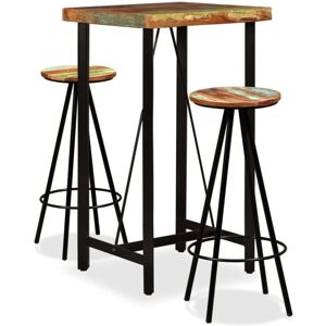 This cool bar set has an industrial look and will make a distinctive addition to any home, bar or restaurant. The bar table and stools are made of solid reclaimed wood, which means that they have the characteristics of different woods like teak, mango wood, acacia, etc. Reclaimed wood is solid, stable, durable and beautiful. Signs of wear give each piece a unique look and the steel legs add to the spectacular industrial style. Every step of the construction process is carried out with the greatest care, be it recombining, polishing, painting or lacquering. Delivery includes 1 bar table and 2 bar stools. Assembly is easy. Important note: The wood grains and colours may vary from piece to piece, making each piece unique and slightly different from the next. The delivery is random, ensuring the exclusivity and individuality of your product. Material: Solid reclaimed wood and steel Polished, painted and lacquered Bar table dimensions: 60 x 60 x 107 cm (L x W x H) Bar stool dimensions: 30