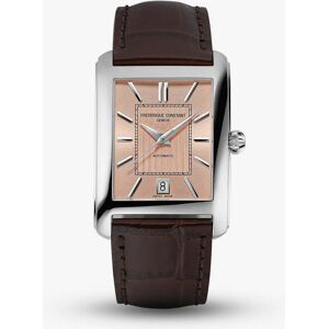 Classic sophistication meets modern design in the Frederique Constant Classics Carrée Automatic. Its distinctive square case and elegant salmon dial with silver-plated indexes make a bold yet refined statement. A rich brown leather strap adds timeless charm, while the date window at 6 o’clock and 38-hour power reserve offer everyday practicality. With a see-through case back showcasing the automatic movement this timepiece is where heritage style meets contemporary craftsmanship. • Powered by the automatic movement with 26 jewels and a power reserve of up to 38 hours. • Presented on a brown leather strap with traditional buckle. • Scratch resistant sapphire crystal glass. • 30mm case width. • 30 metre water resistance.
