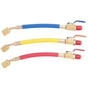 Description: [WIDE APPLICATION] The ac hose with low loss fittings good for R410a and most other refrigerants like R22, R134a, R12, R502.need adapter. [HIGH WORKING PRESSURE] The working pressure of R410 Refrigerant Charging hoses can get 800PSI, burst pressure 4000 PSI. [WELL DESIGN] HVAC Hose designed to features with 45 degrees angle on the service port site for easier access, thread size 1/4 inch SAE male and female flare. Meet 1/4 inch SAE Requirement for Refrigerant Permutation. [PREMIUM QUALITY] The ac charging hose made of aluminum and rubber, premium refrigerant charging hoses last long; easy to operate and install, strong sealing for durability and safety. NOTE:Marked R-410aThe pressure range is suitable for R410a, but it cannot be used directly and needs tobe used with an adapter the label words on the product are random, Cannot be chosen the specific words. The actual product may have slight differences or color differences. Material: rubber colour: Black Package Contents: