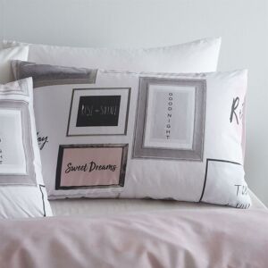 Relax in a contemporary soft blush pink & grey palette this feel-good print features fun, cute on trend quotes that turn your bedroom into a happy zone with positive vibes! Turnover to a soft blush pink reverse - when nothing but pink will do! Catherine Lansfield is renowned for style and quality - designed and developed in Great Britain. Size: Double duvet cover (200x200cm) and 2 matching pillowcases (50x75cm). Material: Polycotton (52% Polyester 49% Cotton). Care instructions: Machine washable at 30°c, can be tumble dried on a low heat.