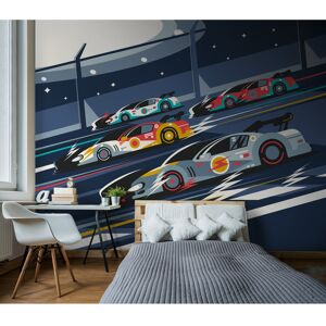 Sportscars of different colours race around a track under a night sky dotted with stars. A sense of dynamicity and movement is created through speedy zigzag symbols around the cars, showing just how fast they’re going. Latitude Run Size: 240cm L x 300cm W