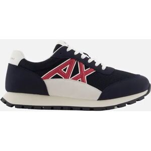 Armani Exchange Echo Suede Mesh Nylon Trainer in Deep Navy/Cardinal Red Step out in bold style with the Armani Exchange Echo Suede Mesh Nylon Trainer. These classic sneakers in a striking Deep Navy and Cardinal Red colourway are instantly elevated by the embossed side logo featuring a contrasting signature. Crafted from a dynamic mix of technical materials, including eco-suede, breathable mesh, and durable nylon inserts, they offer both style and comfort. The two-tone rubber sole provides excellent traction and a modern edge, while the lace-up closure ensures a secure fit. Perfect for adding a touch of sporty sophistication to any casual look. Features Striking Color Combination: Deep Navy and Cardinal Red for a bold visual impact. Embossed Side Logo: Features a contrasting Armani Exchange signature for distinctive branding. Mixed Material Upper: Crafted from eco-suede, breathable mesh, and durable nylon inserts. Two-Tone Rubber Sole: Offers reliable traction and a contemporary aesthetic. Lace-Up Closure: Provides a secure and adjustable fit. Comfortable Lining: 100% polyester lining for all-day wear. Main upper shoe: 100% polyester Secondary upper shoe: 50% polyamide, 50% elastane Third upper shoe: 100% polyester Third outside coating: 100% polyurethane - synthetic material Tongue: 100% polyester Lining: 100% polyester Secondary lining: 100% polyester Secondary lining coating: 100% polyurethane - synthetic material Insole: 100% polyester Midsole: 100% ethylene-vinyl acetate External sole: 100% rubber Style: XUX263