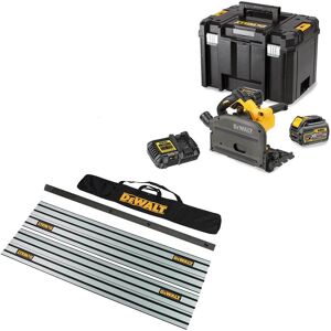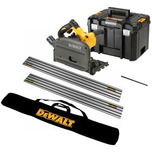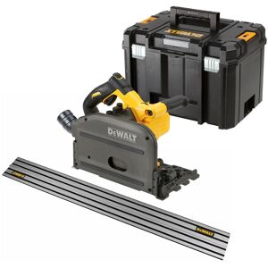 The DeWalt DCS520 FlexVolt XR Plunge Saw has a brushless, heavy-duty motor which offers the same power as a mains tool and makes it perfect for plunging into a wide variety of materials whilst offering consistent speed and an accurate cut under heavy loads. It features an anti-kickback system which allows the user to go about cutting tasks without fear of injury or damage to the workpiece. It will also achieve 90% dust extraction when fitted to an extractor thanks to the closed guard, making it a perfect choice for mobile plunge cutting on site. Specifications • No Load Speed: 2,500-4,200rpm • Blade Diameter: 165mm • Blade Bore: 20mm • Bevel Capacity: 47° • Max. Depth of Cut at 90°: 59mm • Max. Depth of Cut at 90° (with guide rails): 55mm • Max. Depth of Cut at 45°: 44mm • Max. Depth of Cut at 45° (with guide rails): 40mm • Weight: 4.7kg • Hand/Arm Vibration: 1.1m/s² • Uncertainty K 1 (Vibration): 1.5m/s² • Sound Pressure: 82.2dB(A) • Sound Power: 93.2dB(A) Features & Benefits • Parallel plunge allows the user to maintain a smooth and constant hand position • A 42 tooth blade gives a fine and accurate finish with very little breakout in laminates • Rail adjustment allows the saw to be adjusted • Variable speed allows the correct speed to be set • The enclosed guard gives a 90% dust extraction capability • 55mm depth of cut allows the trimming and sizing of most common door sizes • Anti kickback function Contents • DCS520 54v XR Cordless Brushless FlexVolt Plunge Saw • 42 Tooth Precision Circular Saw Blade • Plunge Saw Guide Rail 1500mm • DE6292 Joining Kit for DeWalt Guide Rails • DWS5025 Guide Rail Carry Bag 1500mm • No Batteries • No Charger • T-STAK Stackable Deep Tool Box