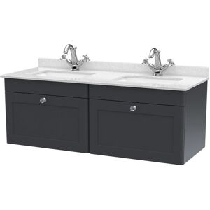 Model Number: CLC1494WS2 Introducing the Nuie Classique Satin Soft Black 1200mm Wall Hung 2 Drawer Vanity Unit, a stunning fusion of style and practicality designed to elevate your bathroom space. This exquisite vanity unit features a luxurious white marble countertop that pairs beautifully with the soft black finish, creating a sophisticated focal point in any traditional or contemporary bathroom setting. The two square basins are not only aesthetically pleasing but also functional, equipped with two tap holes for convenient use. The unit's smart design includes two spacious drawers, perfect for storing toiletries and bathroom essentials, ensuring a clutter-free environment. With a soft close mechanism, these drawers offer a quiet and gentle closing action, enhancing the overall user experience. Made from high-quality MDF, this vanity unit is built to last and withstand the rigours of daily use, while its stylish knobs add a classic touch to the overall design. Key Features: Soft