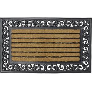 Our Karina tuffscrape doormat is a halfmoon shape that sits snugly up to your door and creating a different style to a traditional doormat. It’s made from 100% coir which comes from natural coconut fibres, sat within a sturdy rubber frame for the perfect finishing touch. The coir mat features embossed detail filled with rubber to create a contrasting design. The coir offers fantastic scraping qualities for muddy shoes and boots and absorbs water well, meaning your floors stay cleaner for longer. The doormat is suitable for all weathers, all year round and used outdoors. The decorative detail greets your guests before they enter the home, the mat can be used at the door, porch, greenhouse, shed, conservatory, or patios. It's strong and durable, making it perfect for busy households. Features: The rubber base ensures it's strong, durable and made to withstand all weathers The mat is made from 100% natural coir (coconut fibres) sat within a heavy-duty rubber frame Eye-catching patterns