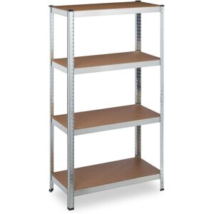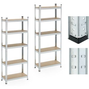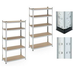 The galvanised steel shelves offer plenty of room for organisation. They provide vital storage for heavier items in the workshop, garage, pantry, cellar, shed or warehouse. Store your tyres, machines, tools, canned goods and other heavy items on the spacious shelving. Assemble the sturdy shelving unit according to your needs - the height of the 5 shelves can be adjusted. If required, you can divide the shelving unit in half and use the two parts separately. Tip: The practical interlocking plug-in system does not require any screws, assembly is quick and easy. You only need a rubber hammer. Use gloves to assemble. Set of 2 Heavy Duty Shelving Units Details - Size H x W x D: approx. 180 x 90 x 45 cm (70.9 x 35.4 x 17.7 in.) - Size per shelf W x D: approx. 89.5 x 44.5 cm (35.2 x 17.5 in.) - MDF panel thickness: approx. 7 mm (0.3 in.) - Weight capacity: approx. 1325 kg - Weight capacity per tier: approx. 265 kg - Weight: approx. 20.8 kg - Material: MDF, Steel, plastic - Colour: Silver'