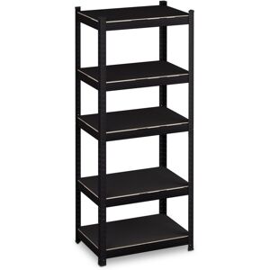 The heavy-duty shelving unit offers plenty of space to create order. As a cellar or workshop shelf, in the utility room, garage or garden shed, it creates indispensable storage space for heavy objects. Store tyres, machines, tools or food supplies in a space-saving manner. Assemble the robust steel storage rack according to your requirements - the height of the 5 shelves is variable. If required, you can divide the cellar shelving unit and use the 2 shelves individually. Tip: You will need a rubber mallet to join the plug-in connections. For your safety, assemble the shelving unit with gloves . Heavy-duty shelf in detail - Size H x W x D: approx. 150 x 60 x 40 cm - Total load capacity: approx. 1250 kg - Load capacity per level: approx. 250 kg - Size per shelf W x D: approx. 59 x 39 cm - Thickness per MDF board: approx. 5 mm - Weight: approx. 15 kg - Material: Steel, MDF, plastic - Colour: Black Load shelf for tools, drinks crates and more - Steel shelf for cellar, garage, workshop or