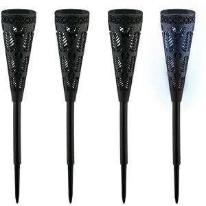 These solar lights come in a handy set to create atmospheric garden lighting. The outdoor torches can be easily inserted into the ground with the help of the ground spikes, making them ideal for path lighting, flower beds and lawns. The solar garden lamps charge in a few hours from sunlight and automatically light up when it gets dark. The recesses in the torch design create special lighting effects. Solar lamps in detail - Overall dimensions H x Ø: approx. 41 x 7 cm - Ground spike H x Ø: approx. 24 x 1.5 cm - Weight: approx. 90 g each - Material: Plastic - Colour: Black Further details of the solar garden lights - Charging time: approx. 4-5 h - Illumination time: approx. 6-10 h - Protection class: IP44 - Protection class: III - Light colour: White light Decorative LED solar lights for the garden - Great as path lights, garden decoration for parties etc. - Attractive look in black torch design - Garden lights simply charge up in the sunlight - Switch on automatically at dusk