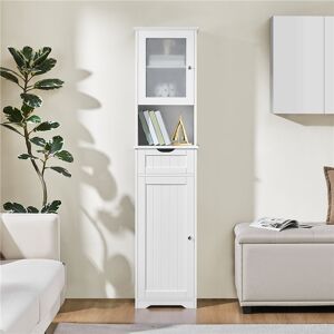 This cabinet is designed for small spaces, it is made of high-quality MDF board and a waterproof finish, and it features a tempered glass door enclosed cabinet, open compartment, drawer, and bottom cabinet for ample storage. The cabinet's anti-tipping device ensures stability and safety, while refined details make it easy to clean and maintain. Ideal for bathrooms, living rooms, kitchens, and any space in need of storage. Yaheetech