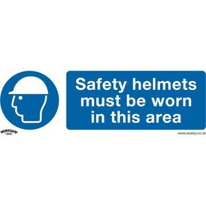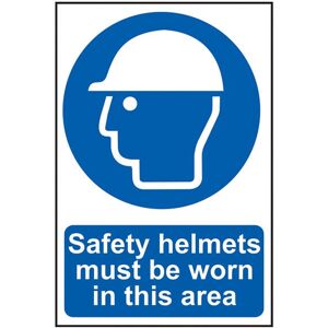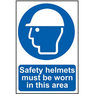 Safety sign illustrating that it is a requirement for safety helmets to be worn in the area. Safety sign available as a self adhesive vinyl or rigid 1mm thick PVC board Complies with ISO 7010 legislation Printed with the text 'Safety helmets must be worn in this area' Commonly found on building / construction sites and other locations where there maybe falling debris