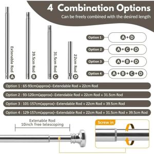 Extendable Shower Curtain Rod without Drilling –4 in 1Sizes Adjustable Breath Extendable Shower Curtain Rod in Stainless Steel No tools, no drilling, no damage, but as stable as a screw Made of 304 stainless steel with a non-slip rubber end, stable, shiny, and rust-proof Quick and easy installation on all surfaces, easily removable without damaging the wall Modern decorative rod for bathroom, kitchen, window, cabinet, closet, etc. Szie A:From 60-295cm Szie B:From 65-100cm Szie C:From 65-160cm Szie D:From 105-300cm The size range of 60 cm to 295 cm is the latest upgraded shower curtain rod on the market. You can freely combine different rods and achieve a length of 60 cm to 295 cm according to your needs with our set of stainless steel rods. Convenient to use in different spaces. Easy to install and remove from the space without tools. Includes 1 extendable rod from 56 cm to 105 cm,3 long rods of 56 cm, and 1 short rod of 33 cm. In total, for a wall distance of 60 cm to 295 cm, all are
