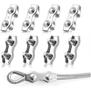 【PREMIUM MATERIAL】The wire rope clamp cable clamp is made of 304 stainless steel, which is corrosion-resistant, acid-resistant and rust-proof with high hardness, and protects the wire rope or cable to avoid wear and tear. They are perfect for indoor and outdoor environment, you can use it in any weather and anywhere. 【SIZE】Total length of Duplex Clamp: 50 mm/1.96 in, side width: 10 mm/0.39 in, thread diameter: 1.5 mm/0.05 in. The M5 duplex bolt cable clamp is suitable for 5 mm wire rope. 【EASY TO USE】The duplex cable clamp is composed of bolt and nut bases, washers, the design of the cable clamp is simple and practical, and easy to use. When you use it, you only need to disassemble the washer and nut, then wrap the cable on both sides of the bolt, and then use a suitable wrench to tighten the nut. 【PERFECT STABILITY】With the high precision of the thread, the duplex cable clamp can prevent the rope inside from slipping during the tightening process, providing high locking capacity and