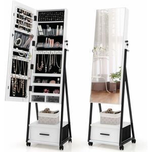 Product Details: Are you still struggling with jewelry organization? You need our mirrored jewelry cabinet. The inside space of the mobile jewelry cabinet features lots of slots, compartments, hooks, drawers and pockets for various sizes of jewelry and makeup. Also, the jewelry armoire is designed with a full length mirror, which is convenient for you to dress up and make up. The cabinet door is lockable and 2 keys are included in the package. The movement is effortless with the 4 lockable universal wheels. Made of premium MDF material and iron frame, the stability and durability of this standing jewelry storage cabinet is assured. Equipped with a large drawer at the bottom Designed with a full length and full screen mirror Smooth rolling thanks to the lockable universal wheels Cabinet door is built with a lock and 2 keys are included Built in soft velvet lining to protect jewelry from scratches Features large storage capacity with multiple storage partitions Suitable for various