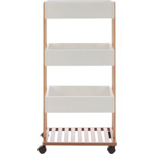 This Nordic style trolley has a modern look featuring three shelves with raised edges providing ample storage space. The shelves sit in a renewable bamboo frame that is contrasted with the chic white colour. The lower shelf is matched with the natural accent featuring an open, slatted base for organising towels or linen completed with caster wheel.