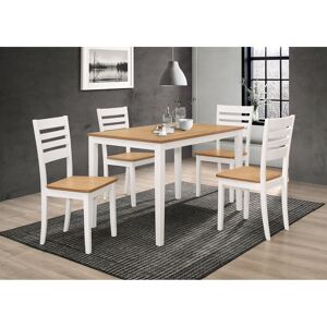 This product brings visual appeal and versatile flair to your well-appointed home. The simple, elegant, and stylish design includes four broad slatted chairs painted white with a natural oak-colored seat paired with the white painted table with a matching natural oak color top. The table's four straight-leg support brings a simple style to any space, making it incredibly easy to incorporate into any kitchen or dining room. Brambly Cottage