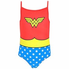 Girls Wonder Woman Swimsuit. Adorable swimsuit perfect for all fans of the Amazonian Princess: Wonder Woman! This striking swimming costume features a large print of the classic Wonder Woman uniform. Whether theyre splashing about in the pool or dipping their toes into the sea, this gorgeous Wonder Woman swim suit will make your little one feel as powerful as Hera!