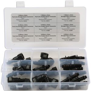 A set of 3 different sized straight fuel line quick connectors allowing for tight connections on 10mm fuel lines. Quick connectors are designed for the automotive industry for the transfer of fuel, oil, water cooling systems and air. The self locking connector enables it to be connected and disconnected with ease and speed, with the wide operating temperature range ensures it can cope with the extreme temperatures that could lead to cracking and leaks. To ease the fitting of the hard plastic fuel pipe to the connectors, use Laser Tools Pipe Connector Insertion Tool, Part No. 6933. Straight connectors, suits: 10mm ID nylon pipe; 12mm ID rubber hose. Constant running pressure: 5 bar (72psi); max pressure: 7 bar (101psi). Operating temperature: -40�C to 120�C. Body manufactured from nylon PA12; O-ring from FKM seal (Viton). Made to SAE J2044-220908 standards. Grey tab for fuel identification (note: AdBlue� specific connectors have red tabs). Included in assorted box of straight quick