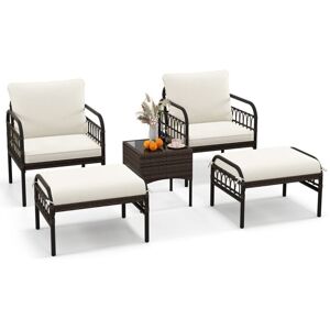 Description: Create an ultimate outdoor oasis with this 5-piece conversation set. Designed with durable solid acacia wood frame and sturdy metal support, this 5-piece furniture set boasts incredible stability and can withstand extended outdoor use. Sink into plush comfort with the soft seat and back cushions. And the ergonomic backrest offers optimal relaxation for your back, ensuring a truly indulgent experience. Made with beautifully woven mix brown PE rattan, this set is not only elegant but also resistant to fading, ensuring its longevity. Transform your backyard or poolside a soothing heaven with this incredible 5-piece furniture set which is made of high-grade material. Features: Solid and stable acacia wood and metal construction for strong support High-density sponge cushions for ultimate comfort Convenient zippers make seat cushion cover simple to maintain Elegant and fade-resistant woven PE rattan for long-time use Ergonomic backrest for effective relaxation Tempered glass tabletop fixed by 3 suction cups is easy to clean Suitable for backyard, poolside and other outdoor places Adjustable footpads for added stability Easy-to-follow instruction for efficient assembly Please avoid rain exposure for prolonged service life Specifications: Color of PE Rattan: Mix Brown Color of Cushion: Yellowish Material: PE Rattan, Metal, Acacia Wood, Polyester, Sponge, Tempered Glass Dimension of Single Chair: 75 x 76 x 80 cm (L x W x H) Dimension of Loveseat: 132 x 76 x 80 cm (L x W x H) Dimension of Small Coffee Table: 48 x 48 cm (Dia x H) Dimension of Large Coffee Table: 60 x 38 cm (Dia x H) Dimension of Seat Cushion: 58 x 55 x 8 cm (L x W x Thickness) Dimension of Loveseat Cushion: 114 x 55 x 8 cm (L x W x Thickness) Dimension of Back Cushion: 48 x 48 x 16 cm (L x W x Thickness) Seat Height: 33 cm Armrest Height: 60 cm Net Weight of Each Single Chair: 11 kg Net Weight of Loveseat: 16 kg Net Weight of Small Coffee Table: 6 kg Net Weight of Large Coffee Table: 7.5 kg Weight Capacity of Each Single Chair: 180 kg Weight Capacity of Loveseat: 360 kg Weight Capacity of Each Coffee Table: 45 kg Package Includes: 1 x Loveseat 2 x Single Chairs 2 x Coffee Tables 2 x Seat Cushions 1 x Loveseat Cushion 4 x Back Cushions 1 x Instruction