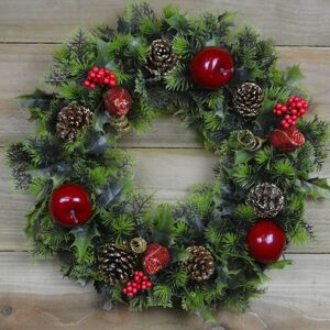 Embrace the magic of a winter wonderland with this stunning Green Wreath. Great as part of a festive display or on its own, this wreath will bring the festive spirit to all visitors. Capturing the charm of Pine cones, Apples and Berries on Green bushy trees, this decoration is perfect for anywhere around your home or garden this year whether you place it on a door, mantle piece or wall. Suitable for indoor and outdoor use. Dimensions: H45cm.