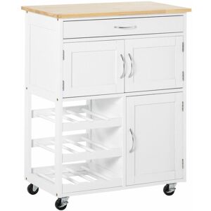This versatile rolling kitchen trolley serving cart from HOMCOM is a perfect addition to your home. With 1 worktop, 1 drawer, 1 Two-tier cupboard, 2 storage shelves, this wood kitchen trolley offers lots of storage space for various utensils. It can be used as an island within your kitchen or for added storage in the bathroom, dining room, garage, laundry room, nursery, or the bedroom. Add a modern natural touch to your living space with this classic rolling kitchen trolley ! HOMCOM Kitchen Storage Trolley Cart Cupboard Rolling Island Shelves Drawer in Brown