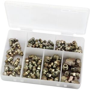 Manufactured from EN - 1A steel with profiles to BS, SAE, DIN. JIS and IS. Heat treated to SAE J534 and hardened. Yellow zinc plated to ASTM B117 specification. in plastic storage box. Features and Benefits • Contents (approx.): 20 x M6 straight; 10 x M6 90°; 15 x M8 straight; 5 x M8 90°; M10 straight; 10 x M10 90° • EN-1A steel with profiles to BS, SAE, DIN. JIS and IS • Heat treated to SAE J534 and hardened • Yellow zinc plated to ASTM B117 specification Contents 1 x 70 Assorted Metric Grease Nipples
