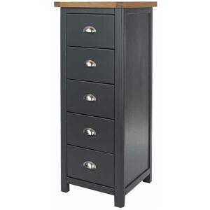 When space is at a premium this 5 drawer narrow chest is ideal, it is made using traditional materials and cabinet construction methods so it is easy for you to assemble. Finished in a luxurious dark carbon grey paint with an antique oak effect waxed hardwood framed top. Drawer boxes are made from hardwood with drawer stops for your safety and are finished with matt silver effect cup handles. Features: luxurious dark carbon finish Antique Oak effect waxed hardwood top matt silver effect cup handles wooden drawers with safety stops easy to assemble . 5 Drawer Narrow Chest. Delivery is free to UK Mainland excluding the following postcodes which will incur a surchage, please check before ordering for these postcodes:- AB30-39, AB41-45, AB51-56, E1-98, EC1-88, FK17-21, G83,84, G90,HS1-9,IV,KA27-28,KW1-17,N1-22,N81,NW1-11,PA20-88,PH15-50,SE1-99,SW1-19,W1-14,WC1-99. 5#7