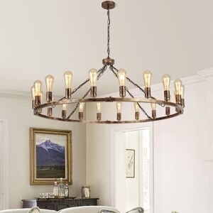 Bronze Wagon Wheel Chandelier ——This 20-light wagon wheel chandelier combines a retro style with a glam design,and it has a high-quality round frame with a simple look and clear lines. Easy and hassle-free replacement of bulbs. Large Farmhouse Chandelier ——This rustic circular chandelier measures 47.2 inches (120cm) in diameter and 32.7 inches (83cm) in height, with an adjustable metal chain up to 47.24 inches (120cm) in length. It suits different ceiling types, including flat, sloped, vaulted, high, and low ceilings, making it a versatile addition to any room. This vintage chandelier adds a touch of rustic charm and elegance to your home. Bulbs Requirement &Dimmable ——This kitchen chandelier light fixture is compatible with a dimmer switch to create different light effects. Voltage: 220V, E27 bulb sockets, compatible with incandescent, LED, CFL, and halogen bulbs. (60W max, light bulbs are not included). Wide Application ——This large round chandelier is perfect for areas with high