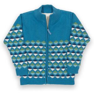 Outer: 100% organic cotton Lining: 100% polyester Hygge knit design French blue 5-gauge chunky plain knit Zip through with French blue herringbone tape zipper pull Long sleeved French blue ribbed cuffs and hem Fully fleece lined Stand up rib collar Made in India Machine washable at 40 degrees, or at 30 degrees to be kinder to the planet