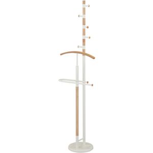 Practical and refined coat rack / valet stand made of pine wood and finished in white and light oak. It consists of a pole of 178cms height with five hooks in white and distributed in different heights, a curved hanger and a trouser rail. The rounded base gives stability to the coat rack. Its neutral design and the Nordic style will fill your room with elegance and sophistication. Isabelline