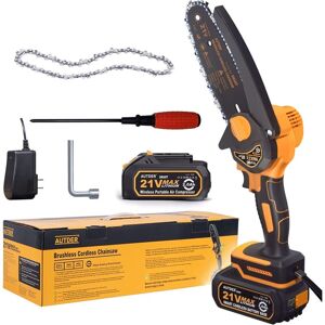 Small Chainsaw & Portable Chainsaw: Chainsaw size, 6.1x4.5x17.1 inches, 15.5x11.5x43.5cm, mini cordless chainsaw weight, 2.76 pounds, 1.25kg, can be easily handled and secured. Chain speed 6M/S, guide plate size: 6 inches plus, cutting 10-15cm diameter brush and wood will be simple and easy. Safe and reasonable design: The chainsaw adopts brushless motor, durable and efficient, LED light will automatically turn on when using, convenient for using in dark places, there are heat dissipation holes, which can slow down the heat during use, chain saw switch button forward and reverse, left, forward, right, reverse, which can prevent chainsaws from being stuck during use, medium speed, which locks the chain rotation, plays a protective role in the installation of batteries. Note: Please use the charger included in our package to charge the battery, other chargers may damage the battery. When installing the battery, please pull the switch to the middle first to lock the operation of the