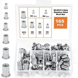 1. Sturdy and durable: made of high quality stainless steel. 2. The knurled nut makes it easy to insert into the workpiece. 3. Can be easily installed in many different materials including steel, plastic and fiberglass. 4.Type: M3 M4 M5 M6 M8 M10; Packing quantity: 165pcs; Comes in a convenient plastic box. 5. Excellent rivet nut installation tools, making the job easier and faster.