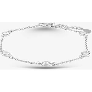 Five shimmering cubic zirconia crystals have been bezel-set between lengths of trace chain to create this delicate and subtle bracelet, perfect for wearing alone or as part of a stack. A sturdy lobster clasp fastens the piece to the extender chain to ensure a perfect fit every time. - White Cubic Zirconia - Sterling Silver - 6.5"-8.5" adjustable trace chain - 5mm bezels