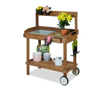 Say goodbye to strenuous gardening activities, including pain and dirty knees! With this handy table, you can stand up while repotting plants or tending to smaller gardening tasks. Thanks to the two shelves and practical wheels, you can always keep your utensils in reach. Whether it is your garden, greenhouse or balcony, this gardening stand is a handy helper anywhere. Equipped with flowers, herbs and more this stand is a really decorative piece. Plant Table Details - Total size H x W x D: app. 120 x 97 x 49 cm - Weight:app. 9 kg - Capacity: app. 15 kg per tier - Material: Wood, plastic, steel - Colour: Brown 2-Tiered Garden Plant Table - Worktop W x D: approx. 89.5 x 43 cm - Height of work surface: approx. 80 cm - Lower shelf W x D: approx. 88 x 42.5 cm - Narrow shelf W x D: approx. 86.5 x 8 cm - Sink inner dimensions H x W x D: approx. 9 x 35 x 27.5 cm - Drawer interior dimensions H x W x D: approx. 6.5 x 22 x 30 cm - Distance between the 2 large shelves: approx. 45 cm Gardening