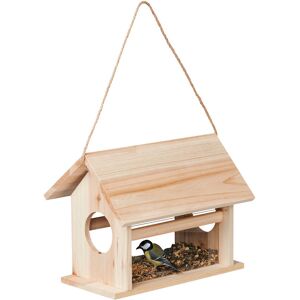 Make wild birds happy in the hard winter or in the warm season with this feeding station. The bird feeder can simply be hung on a hook or tree or placed on the balcony, terrace or in the garden. The transparent food container gives you a good overview of whether food needs to be refilled, which is easy thanks to the hinged roof. This way you and your loved ones can relax and watch the birds eating. Bird feeder in detail - Overall dimensions H x W x D: approx. 24 x 30 x 21 cm - Height with suspension: approx. 49 cm - Inner dimensions bird feeder H x W x D: approx. 22 x 22 x 9 cm - Weight: approx. 0.8 kg - Material: Fir wood, plastic - Colour: Natural Natural bird feeder to hang up - Bird feeder for garden, balcony or terrace - Simply hang on a branch or hook - For feeding and watching small wild birds - Hinged roof is ideal for easy filling - Filling quantity in view thanks to transparent feeding container