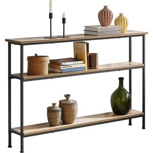 A diverse and contemporary product, would be suitable for a variety of locations, like hallway, living room and office. 3 shelves provide plenty of storage and display space for you. It features adjustable feet under each metal leg to ensure it stay level on uneven floor. 20cm in depth, the side table is narrow enough to fit even in a small corridor. Made of high quality particle board with wooden effect and black powder coated steel frame. Stable and durable. It is very multi-functional due to the slender and clean design yet practical feature. The simple lines and subtle industrial style will give a contemporary twist to the focal point of any living room. Product Details Material: Particle board, metal. Dimensions: W120 x D20 x H77cm. Weight: 10kg. Load capacity: 50kg. Item comes in a flat pack and requires self-assembly. Detailed instructions supplied. The decorative elements are not included in the delivery.