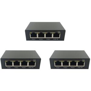 Compliant with IEEE 802.af Power over Ethernet (10/100/1000M support). Extends PoE range by an additional 100 meters. Smart Protection: Overcharge protection, Overload protection, Overdischarge protection, Overcurrent protection, Temperature protection, Overload protection. 1 input and 3 outputs, Gigabit Ethernet port, without power supply, can power 3 POE devices. The 3-port PoE extender can transfer Ethernet and PoE power for 1 end device via Cat5, Cat5e, Cat6, Cat6e, UTP cables. The 3-port PoE extender has 3 10/100/1000M LAN ports, one for power input and the other 3 for power output. Work with network devices such as access points, IP cameras, IP phones, etc. without power cord or far from power outlets. Maximum output power: 30W Color: Black Material: Metal Size: 82x55x25mm Package Contents: 3 * POE Extender Only the above package content, other products are not included. Note: Light reflection and different displays may cause the color of the item in a little different from the