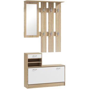 Keeping coats, bags, shoes, accessories and outerwear has never been so efficiently stylish. Crafted from particle board in a versatile natural wood and white finish, this HOMCOM 3-in-1 hallway organiser will keep your living space clutter-free. Alongside the six coat hooks, it features a pull-down shoe cabinet, a top drawer, a shelf for displaying ornaments and a handy mirror. You'll never misplace anything again!Features:Combines a mirror, coat rack, storage and shoe cabinet in a compact designAdjustable shelf to fit in smaller and larger items as neededSturdy particle board structure, with a smooth and protective melamine coatingThree metal handles for effortless opening and closingAssembly required