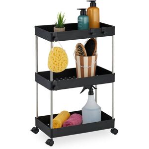 The trolley is the perfect piece of furniture for the bathroom or kitchen to create practical storage space even in tight nooks and crannies. With 3 shelves, the narrow trolley offers enough space for spices, cleaning products, supplies and other bathroom or kitchen utensils. The 4 castors and side handle make it easy to move the trolley back and forth. Thanks to the open design, you always have the stored utensils to hand. Niche trolley in detail - Overall dimensions H x W x D: approx. 66.5 x 42 x 20 cm - Internal dimensions of compartments H x W x D: approx. 29 x 36 x 17.5 cm each - Load capacity per shelf: max. 8 kg - Weight: approx. 5.3 kg - Material: MDF, iron, plastic - In various colours Narrow niche shelf with castors - Ideal storage space for small bathrooms and narrow kitchens - For storing cleaning products, supplies and more - Fits perfectly in niches thanks to its narrow width - With 4 castors for easy manoeuvring - 2 locking brakes for a secure stand - Raised edge of the
