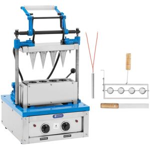 You serve ice cream cones non-stop? Then the Royal Catering ice cream cone machine is the ideal addition to your business. With it, you bake 2 identical ice cream cones in 1 - 2 min. Whether for the ice cream parlour, a café or the large kitchen - with the ice cream cone machine, you can secure ice cream cones according to your own recipe at any time! The croissant maker is very easy to operate: You set the desired temperature for the upper and lower baking plates separately on the clearly arranged thermostats. Fill the moulds of the lower baking tins with the pre-made batter. Then press down the upper part with the help of the handy lever. The ice cream cone maker works with powerful 2100 W. The high power speeds up the baking process so that the croissants bake in just 60 - 120 seconds. After baking, separate the lower baking plates with a lever so that the finished croissants fall into a container. With 2 croissants in one run, you will achieve a throughput of 50 - 60 crispy waffles per hour. Your advantages: The ice cream cones are all perfectly formed and have the same shape, every time they are baked. You also decide which ingredients go into the waffle batter; The waffle croissant machine has a high-quality finish, making it robust and suitable for regular use. They are also easy to operate and clean in no time at all. Simply sweep off the dough residues from the easily accessible baking plates.