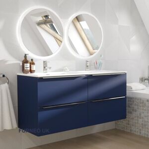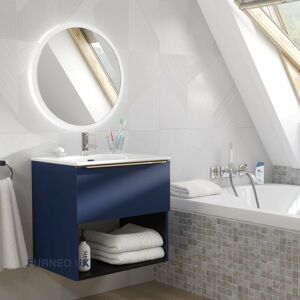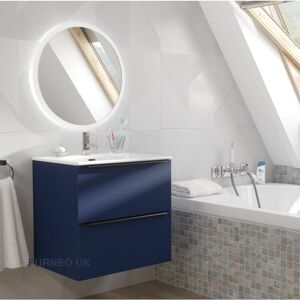 Bathroom vanity cabinet featuring a blueberry matt exterior finish, and a matt black handle. The cabinet is characterised by a single drawer with soft close runners, for your toiletries, and a lower open shelf for towels and other items. A modern basin is included with the product, however, please note that tap and waste is not included. Dimensions: (WxHxD): 60cm x 57cm x 45.6cm This is an assembled product that will require wall mounting. Picture instructions, and a supplementary written notice are included with the item and these should be looked over carefully, prior to attempting mounting. The set includes a fixing set to hang the unit on the wall, but this doesn't include wall plugs, you will need to purchase this separately in line with the wall type the item will be hung on.